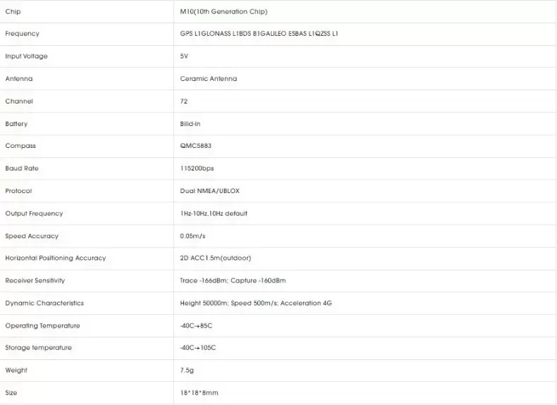 Foxeer M10Q 120 GPS は、RC 飛行機や FPV ドローン向けに特別に設計された高性能ナビゲーション モジュールで、正確で信頼性の高いナビゲーションを実現する高度な第 10 世代 (M10) チップを搭載しています。GPS L1、GLONASS L1、BDS B1、Galileo E、SBAS L1、QZSS L1 など複数の衛星群をサポートし、広範囲の正確な測位を実現します。また、内蔵の QMC5883 コンパスによって正確な方向データ (厳しい磁気環境でも安定した飛行を確保) と高性能セラミック アンテナ (-166 dBm のトレース感度と -160 dBm のキャプチャ感度) が提供され、信号取得と安定性が向上します。さらに、デュアル NMEA/UBX プロトコルをサポートしているため、さまざまなシステムと簡単に統合でき、出力周波数を 1 Hz ~ 10 Hz (デフォルトは 10 Hz) に設定してさまざまなニーズに対応できます。仕様面では、入力電圧は5V、ボーレートは115200bps、速度精度は0.05m/秒、水平位置精度は1.5m(屋外)、動的特性は最大高度50000m、最大速度500m/秒、最大加速度4g、動作温度範囲は-40°C~+85°C、保管温度範囲は-40°C~+105°C、重量はわずか2.7g、寸法は12.5 * 17 * 5mmで、パッケージにはM10Q 120 GPSモジュール1個とケーブル1セットが含まれています。