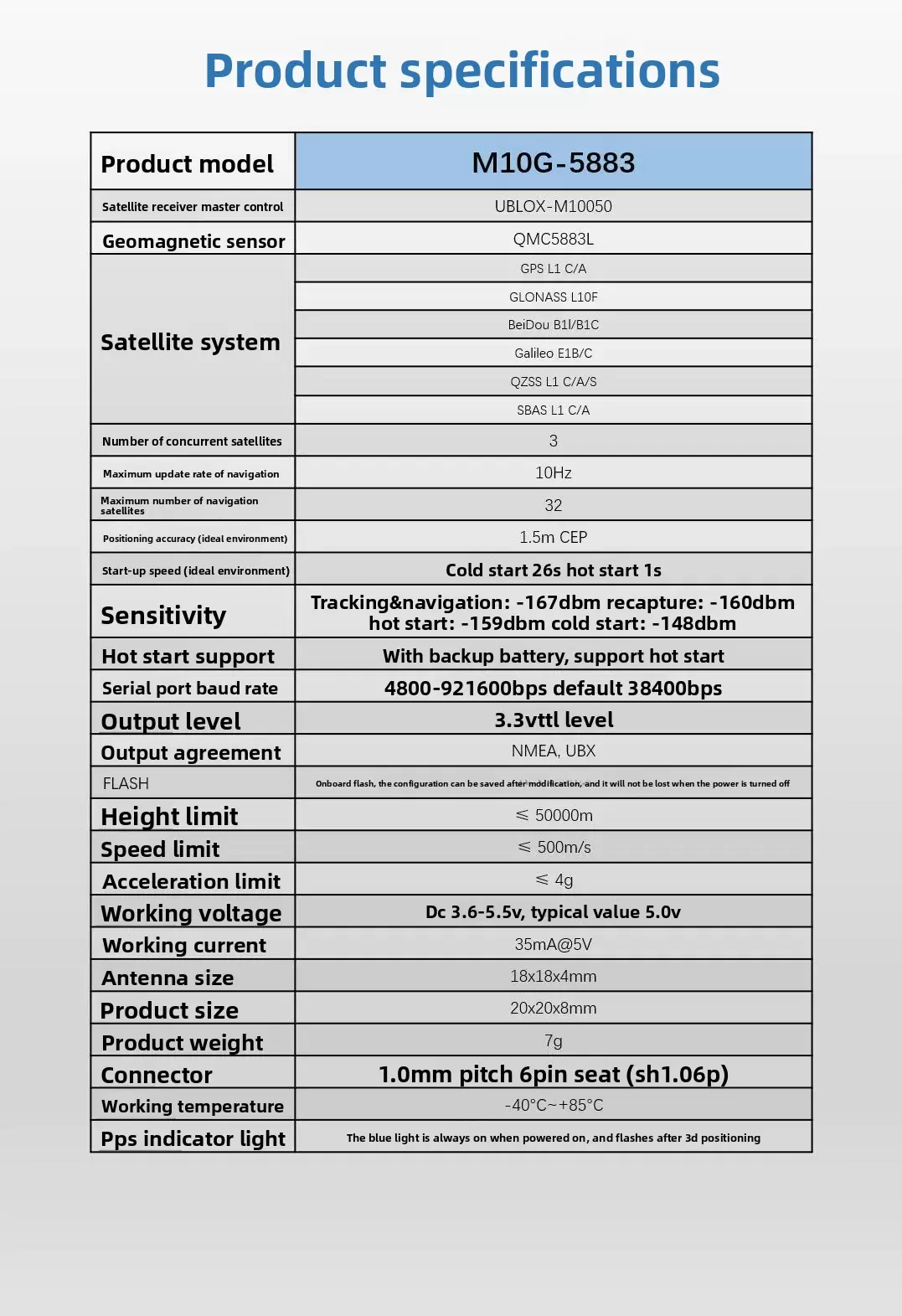 M10G-5883GNSSモジュールは、Ubloxの最新世代チップM10を採用し、強力な性能とより高速な星探索速度を誇ります。最大32基の衛星を捕捉し、高精度な測位を実現します。搭載されている高性能地磁気コンパスセンサーQMC5883Lは、わずか20×20×8mmと小型で設置も容易です。高性能かつ小型の輸入アンテナを採用し、コンパクトな設計で性能低下もありません。重量はわずか7gと軽量で、小型のタイムトラベル機、周回機、軽量固定翼機などに最適です。